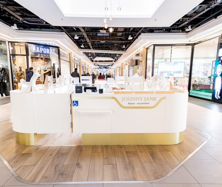 Spots vitrine LED, caisson lumineux, vitrines sur mesure, support IPAD, cage à Drones pour démonstration. Matériaux utilisé : sol en lino, bois stratifié, filet sécurité pour vols de drones.