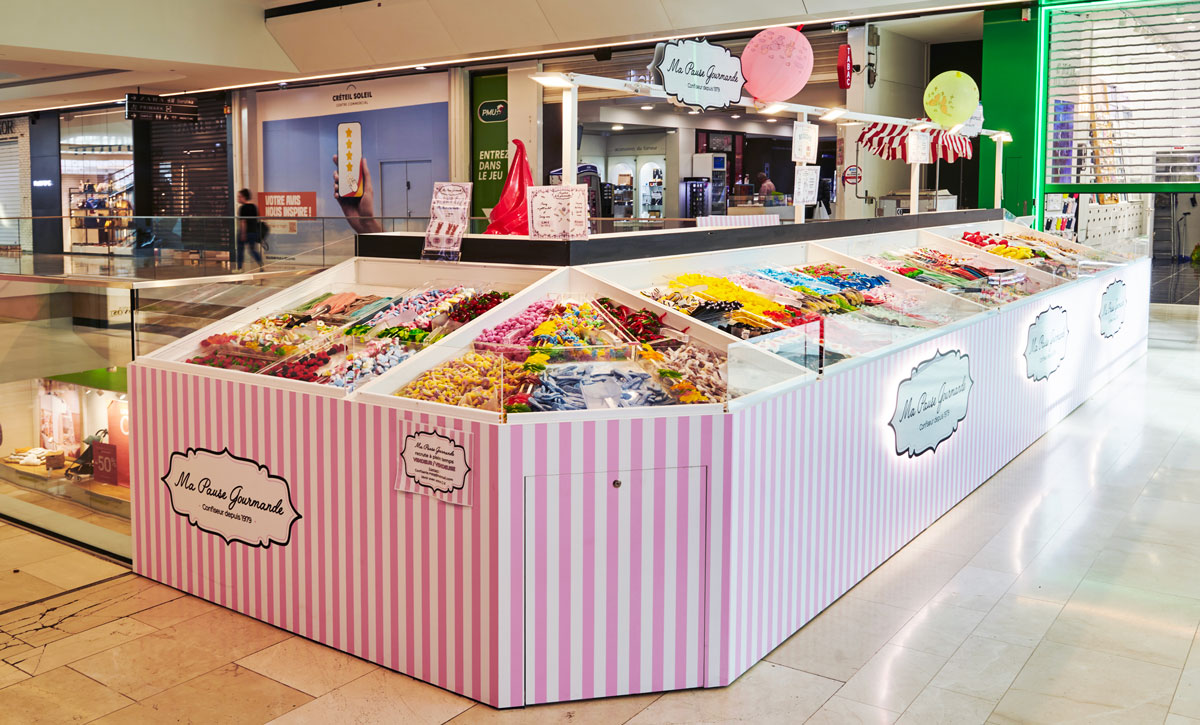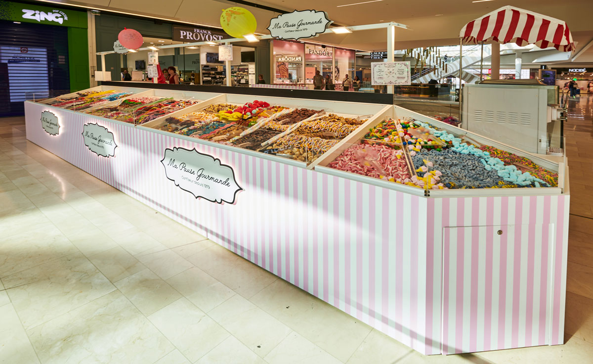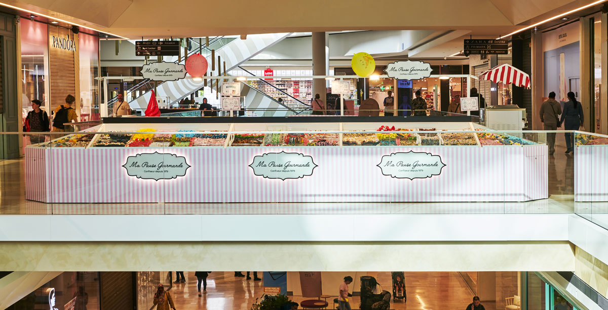 Pour La Pause Gourmande, nous avons conçu un stand pop-up sur mesure, imaginé pour s’intégrer parfaitement dans l’environnement vivant et fréquenté des centres commerciaux.