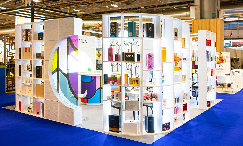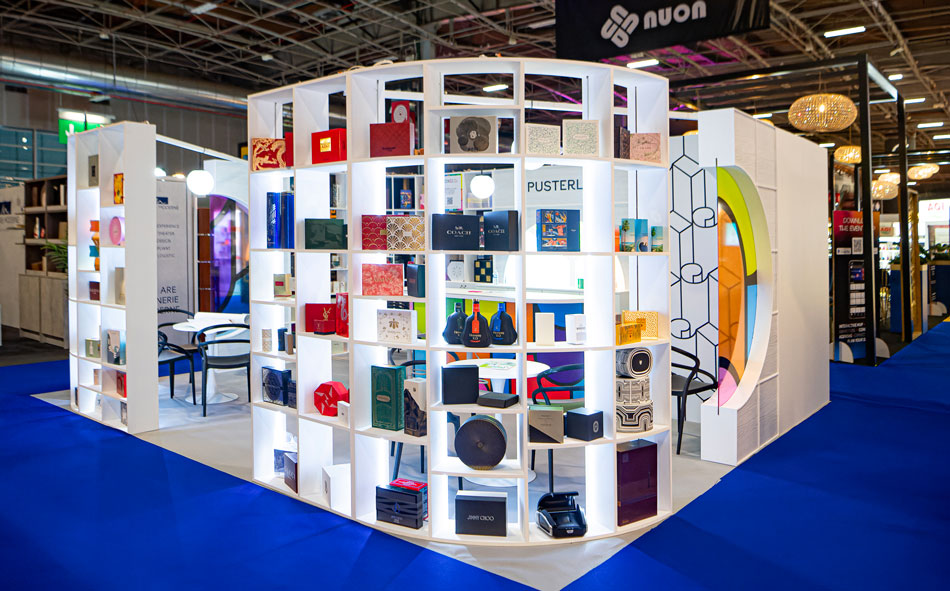 L’architecture épurée révèle le savoir-faire historique de la maison à travers des jeux de volumes, de matières nobles et de transparences maîtrisées. Chaque détail scénographique a été pensé pour sublimer l’excellence des emballages et traduire l’engagement durable qui définit Pusterla.