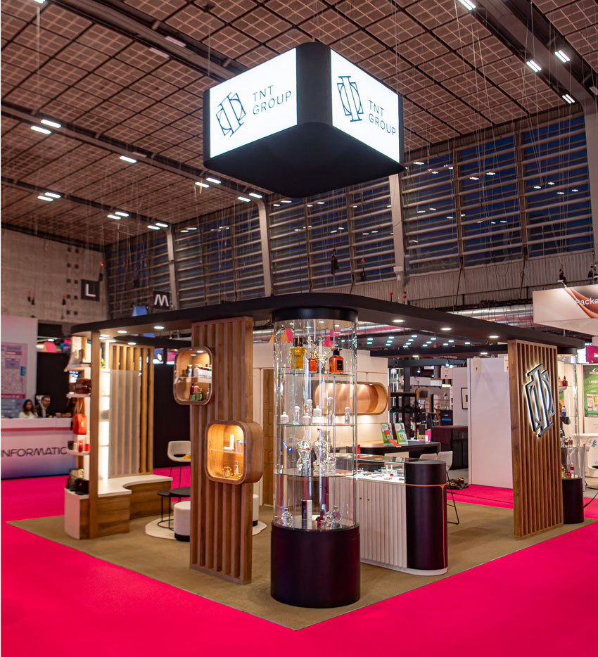 Pensé comme un écrin premium, le stand TNT Group associe lignes architecturales affirmées, bois chaleureux et vitrines lumineuses pour sublimer les produits. Les colonnes en lattes verticales structurent l’espace avec élégance, tandis que les présentoirs rétroéclairés et la suspension cubique signature renforcent son impact visuel. Un univers à la fois contemporain, raffiné et parfaitement aligné avec l’expertise haut de gamme de la marque.